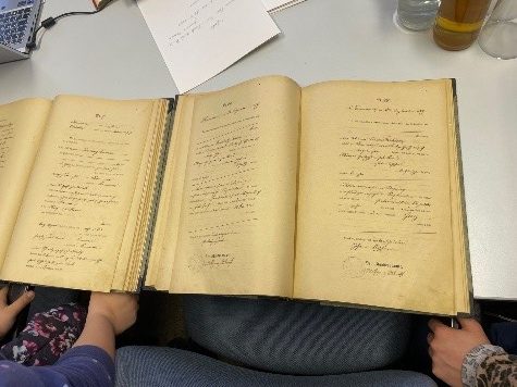 Im ersten Stock ging es um die Einnahmen der Gemeinde und dort durften wir sogar den Tresor bestaunen. Außerdem erklärten uns Frau Müller und Herr Diller einiges über das Standesamt und die Finanzen der Gemeinde. Und dann erwartete uns noch eine besondere Überraschung. Die Archivarin der Gemeinde, die sich an einem Tag in der Woche um all die alten und neueren Unterlagen Kemmerns kümmert, erzählte uns viel über ihre Arbeit und zeigte uns alte Bücher des Standesamtes und sogar eine Liste mit Einkäufen von etwa 1765. Viel ältere Dokumente gibt es bei uns in Kemmern leider nicht, da das Rathaus zwischenzeitlich auch als Unterkunft genutzt wurde.