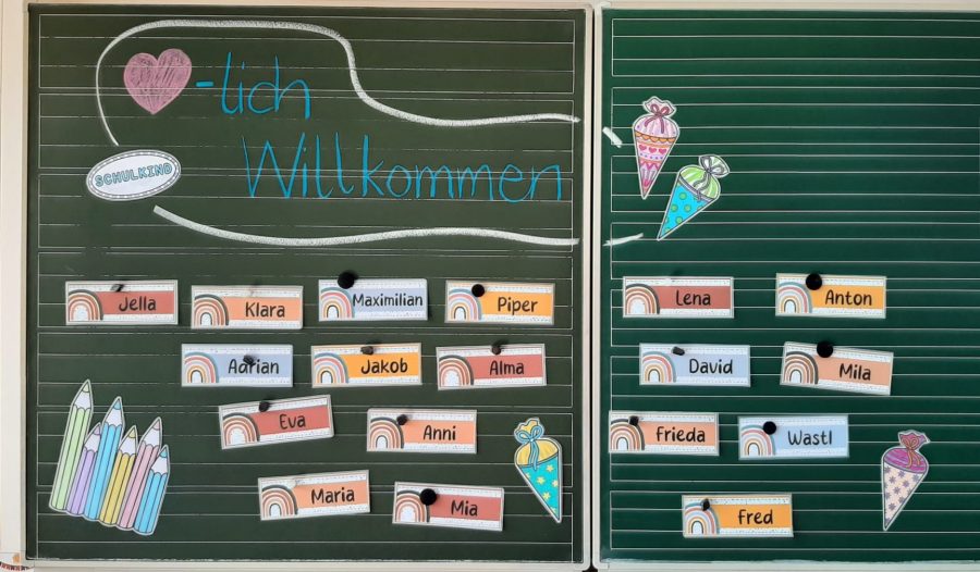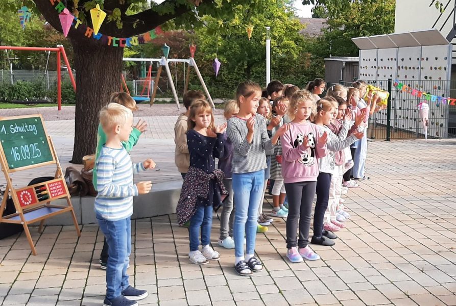 Gut behütet können sich die 17 neuen Erstklässler bei ihrer Lehrerin Frau Endres fühlen.
