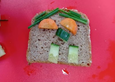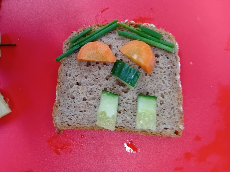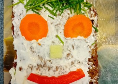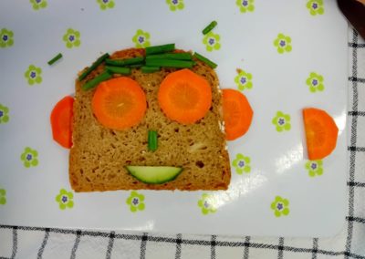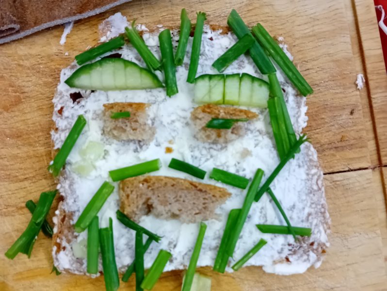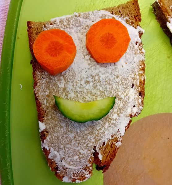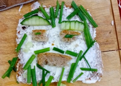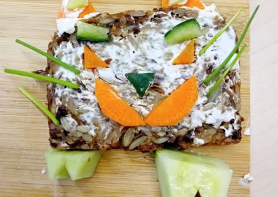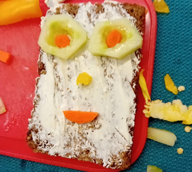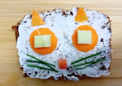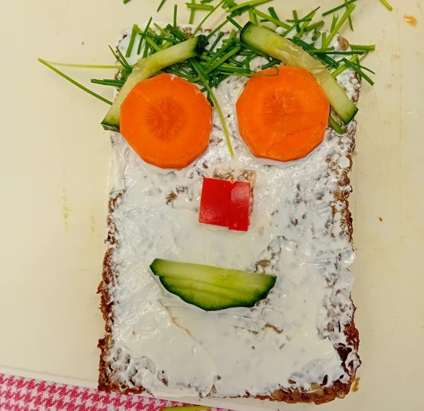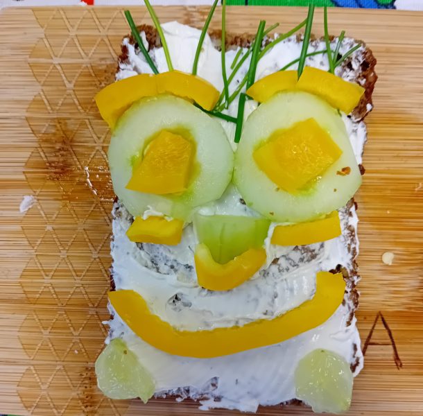 In der ersten Doppelstunde informierten sich die Kinder über die Ernährungspyramide und durften verschiedene Brotsorten fühlen, riechen und schmecken. Auch erfuhren sie, dass sie sehr wohl naschen dürfen – allerdings jeden Tag nur eine Handvoll. Anschließend bereiteten sie „Lustige Brotgesichter“ zu, die wirklich lustig aussahen und dazu auch noch köstlich schmeckten.