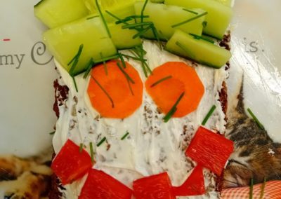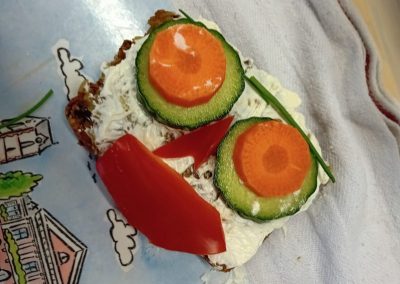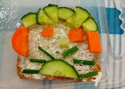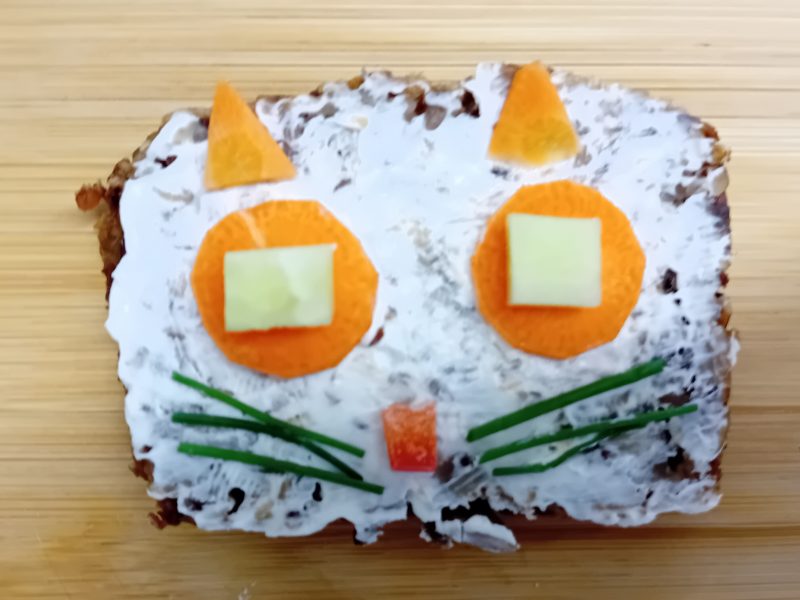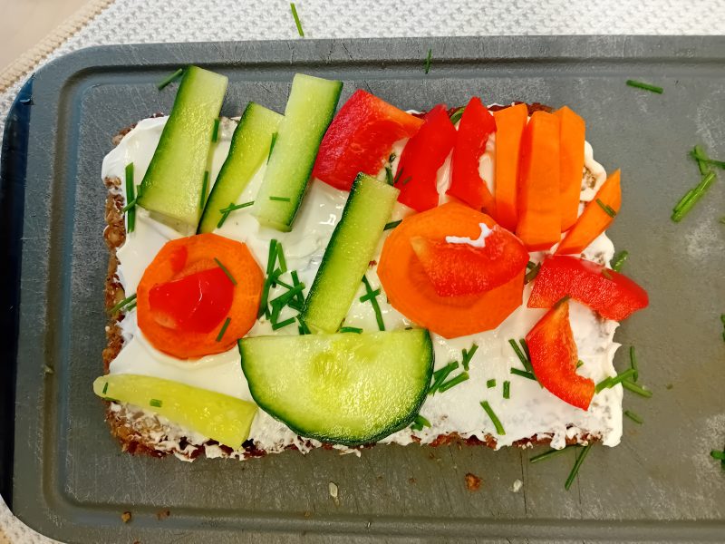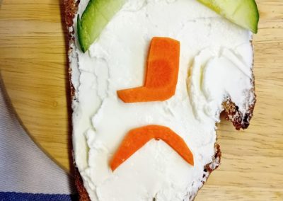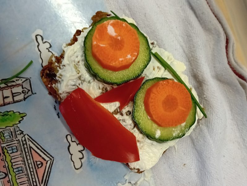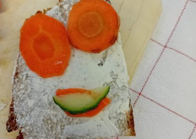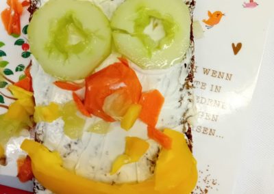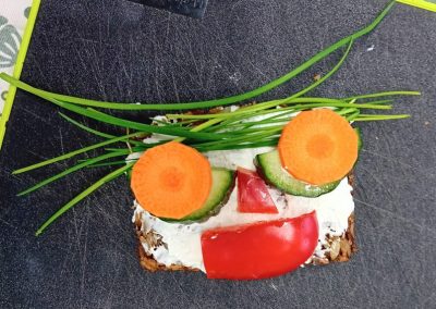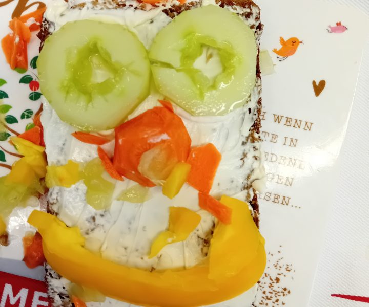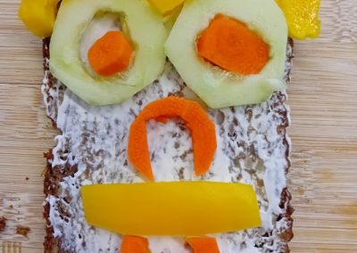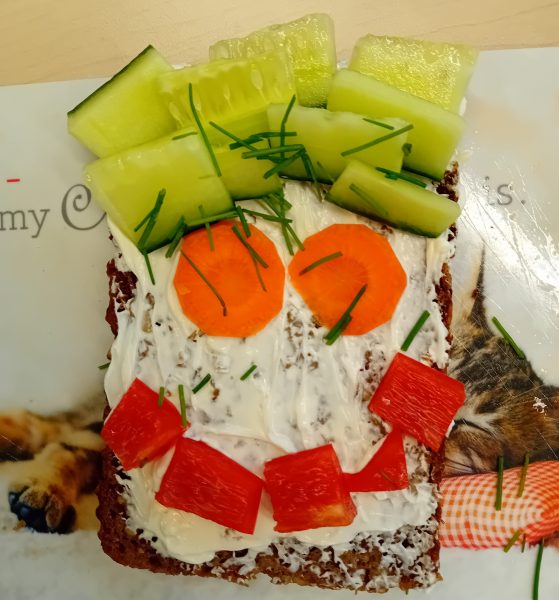 In der ersten Doppelstunde informierten sich die Kinder über die Ernährungspyramide und durften verschiedene Brotsorten fühlen, riechen und schmecken. Auch erfuhren sie, dass sie sehr wohl naschen dürfen – allerdings jeden Tag nur eine Handvoll. Anschließend bereiteten sie „Lustige Brotgesichter“ zu, die wirklich lustig aussahen und dazu auch noch köstlich schmeckten.